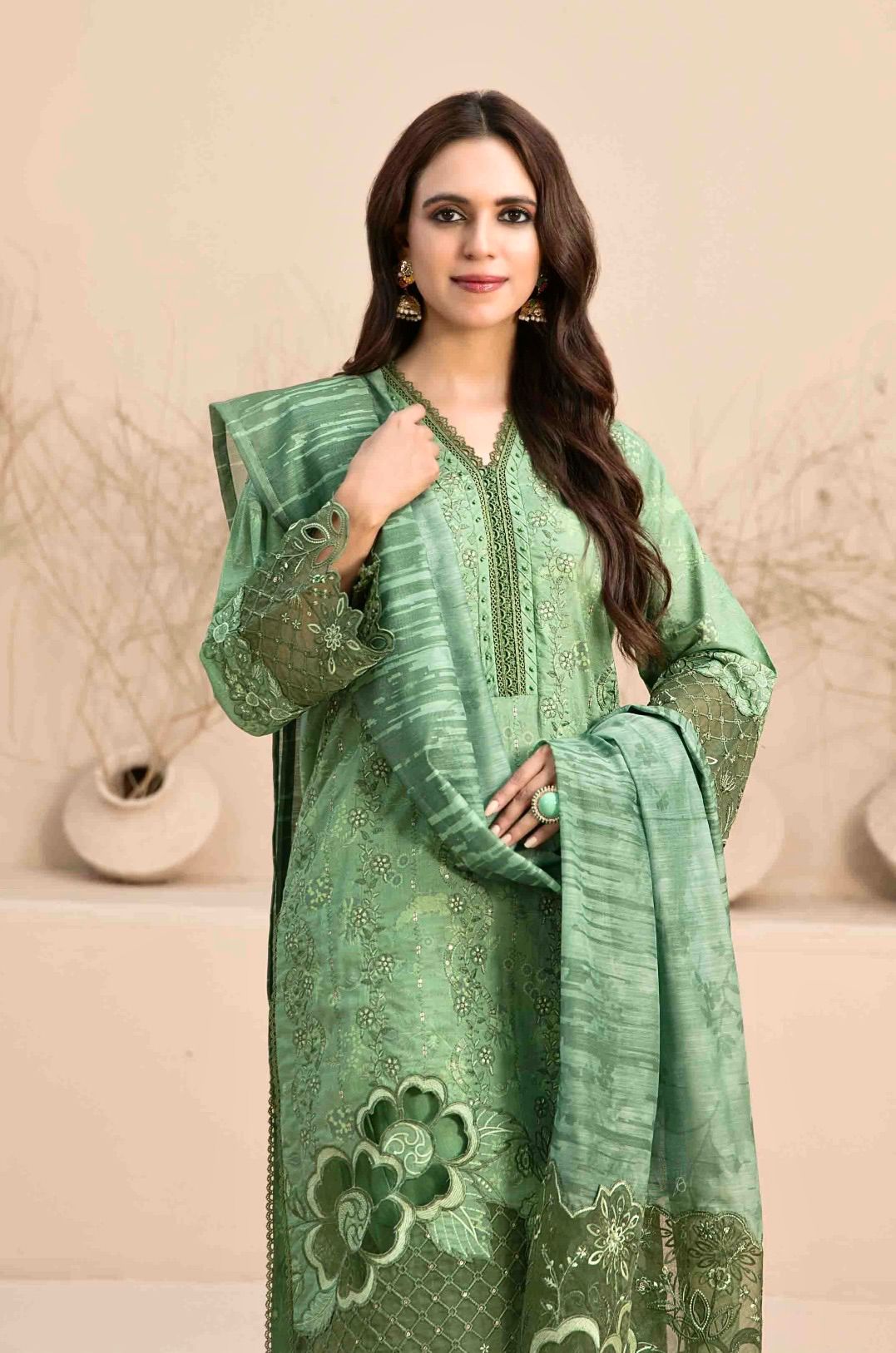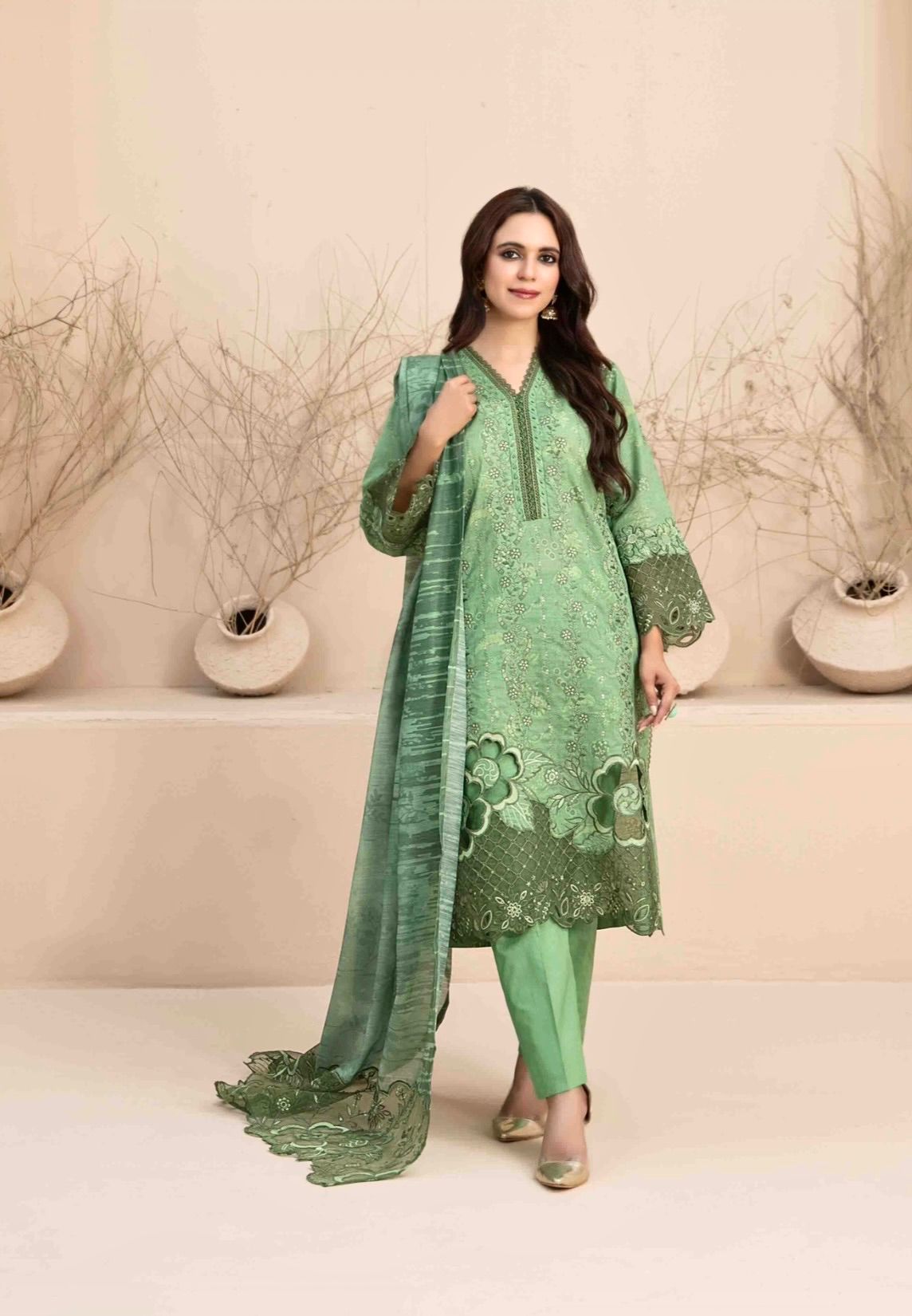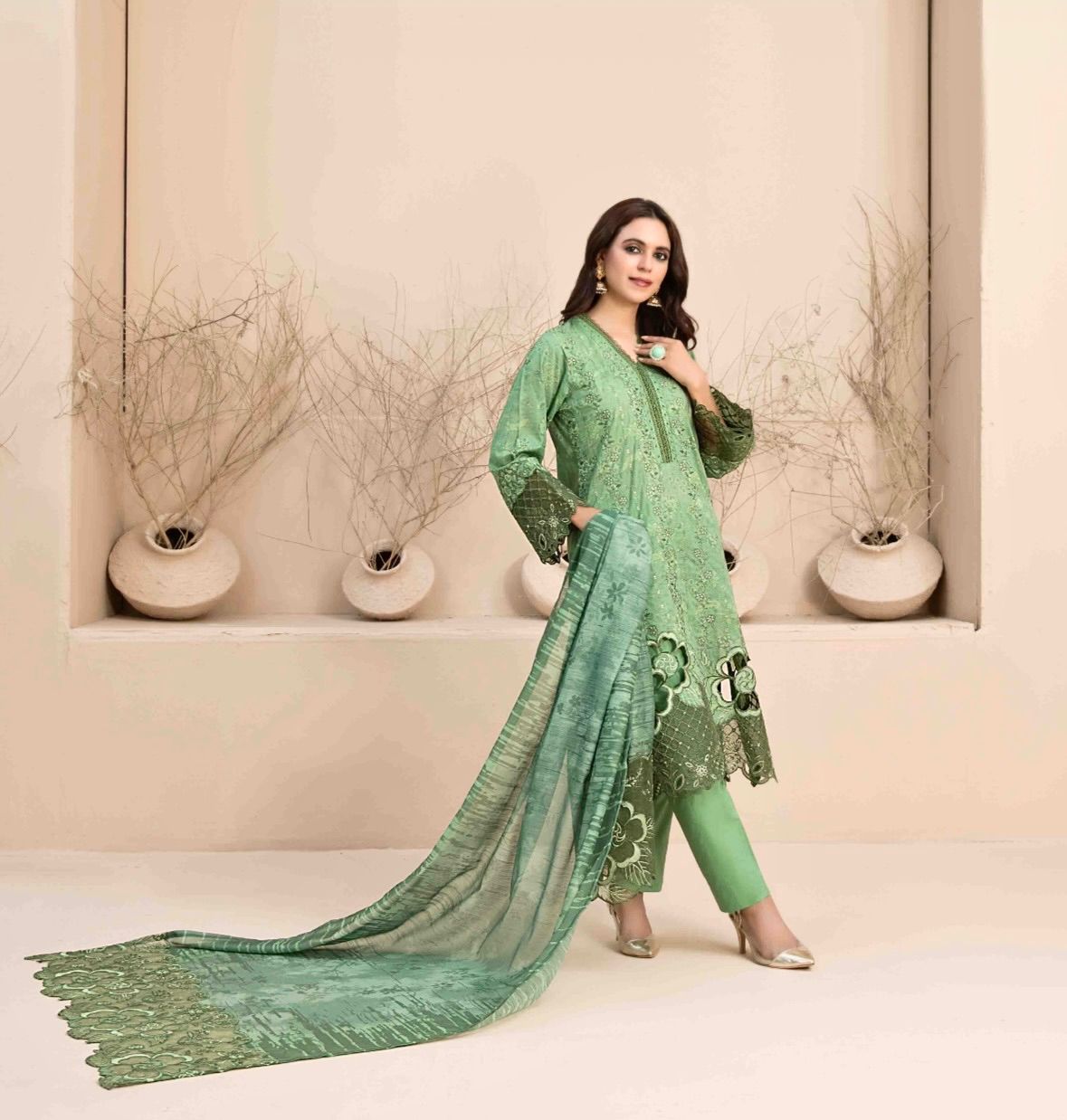 Dupatta en coton et organza, sublimé par de délicates broderies, apportant une touche chic et harmonieuse à l’ensemble.