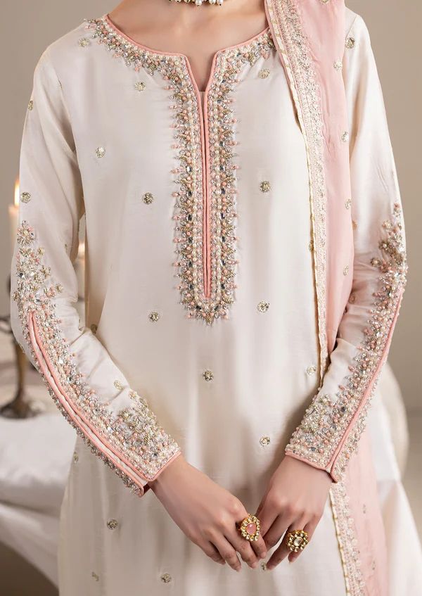 Le dupatta  entièrement sublimé par de délicates broderies et perlages , apportant une touche chic et harmonieuse à l’ensemble.