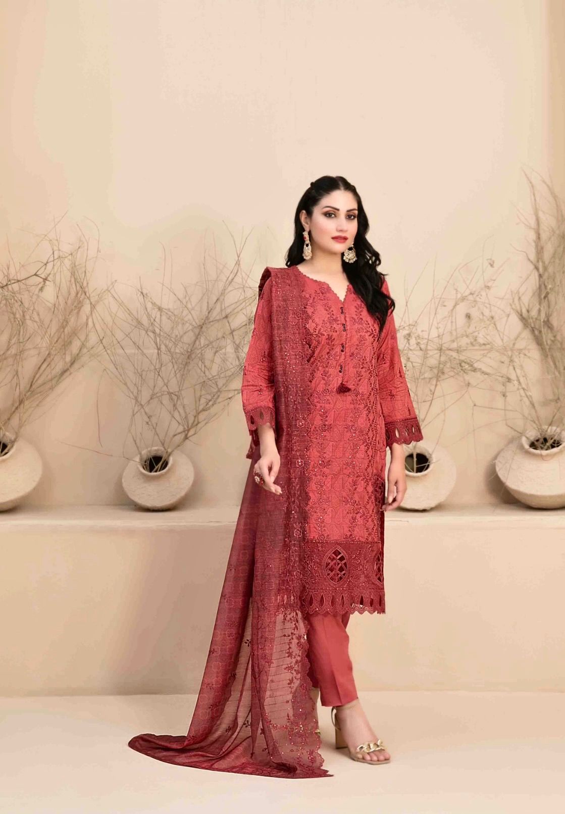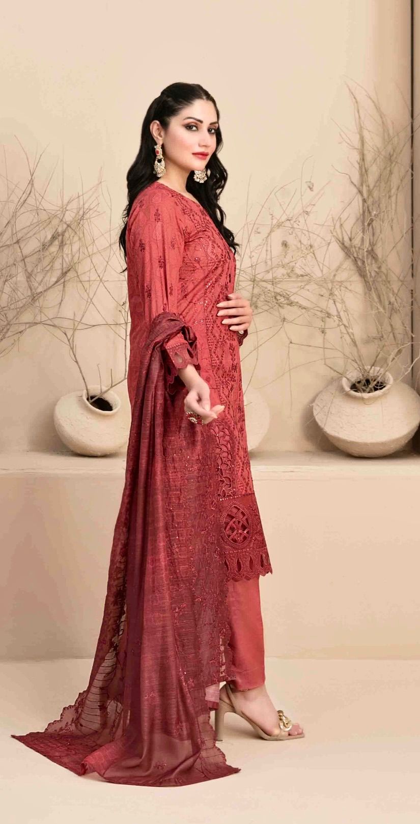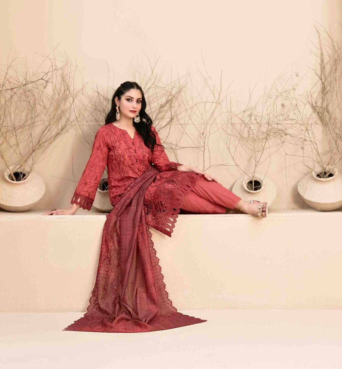 Dupatta en coton, sublimé par de délicates broderies, apportant une touche chic et harmonieuse à l’ensemble.