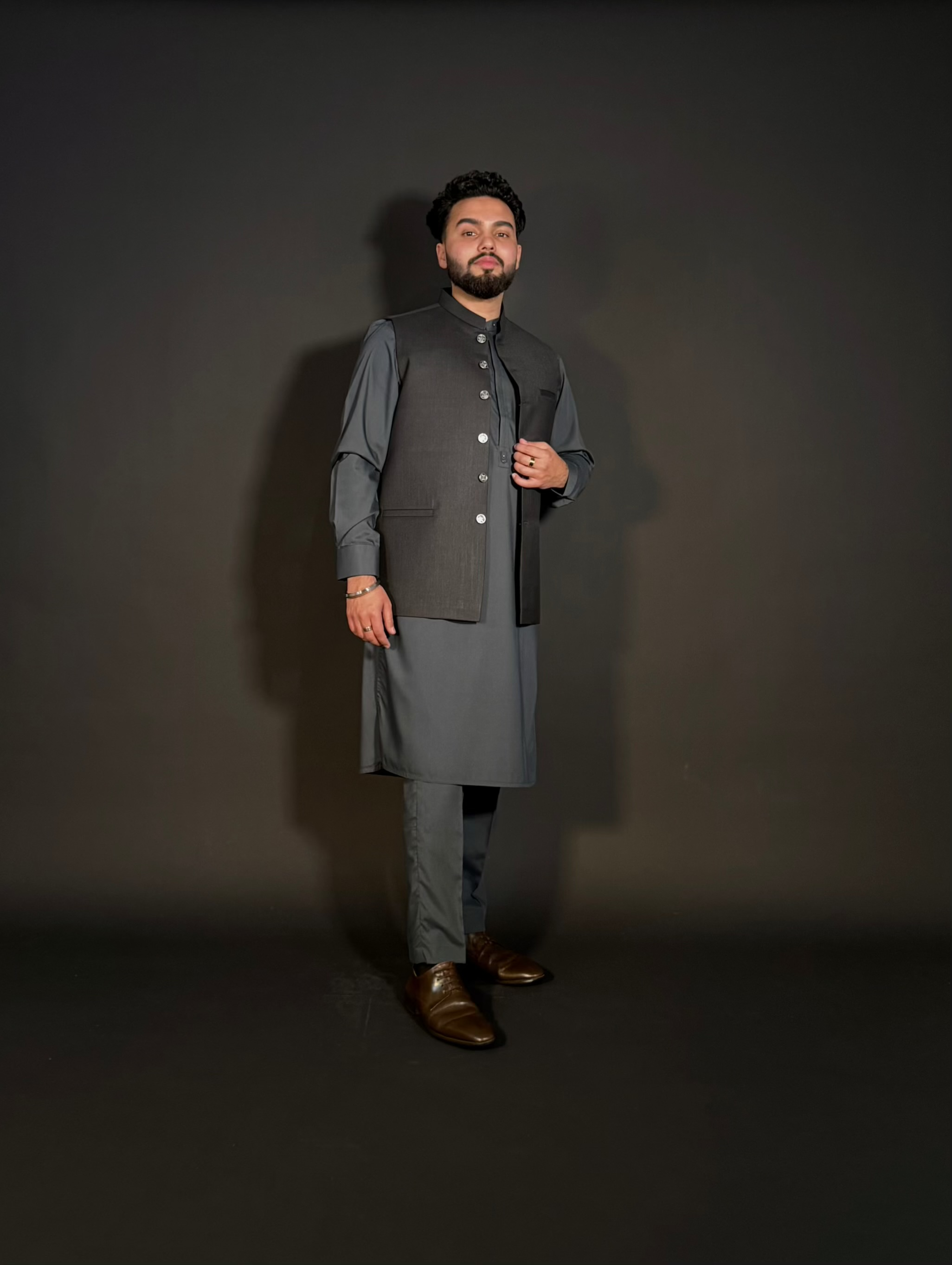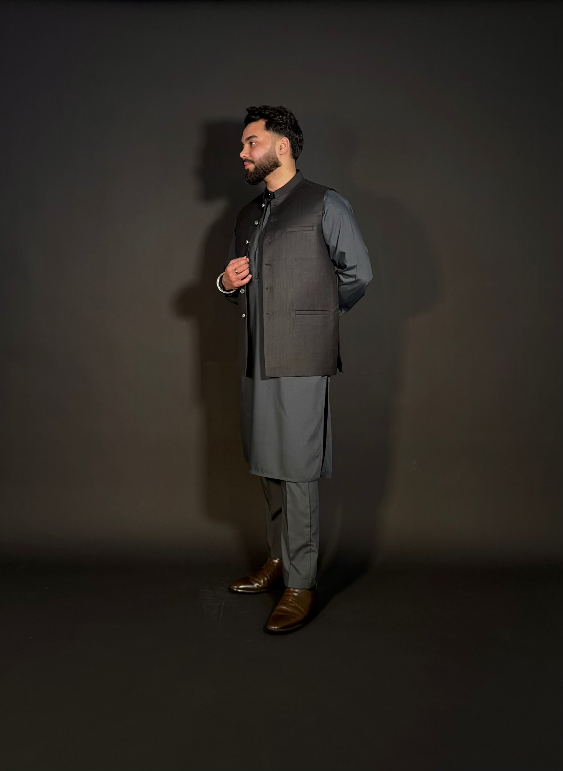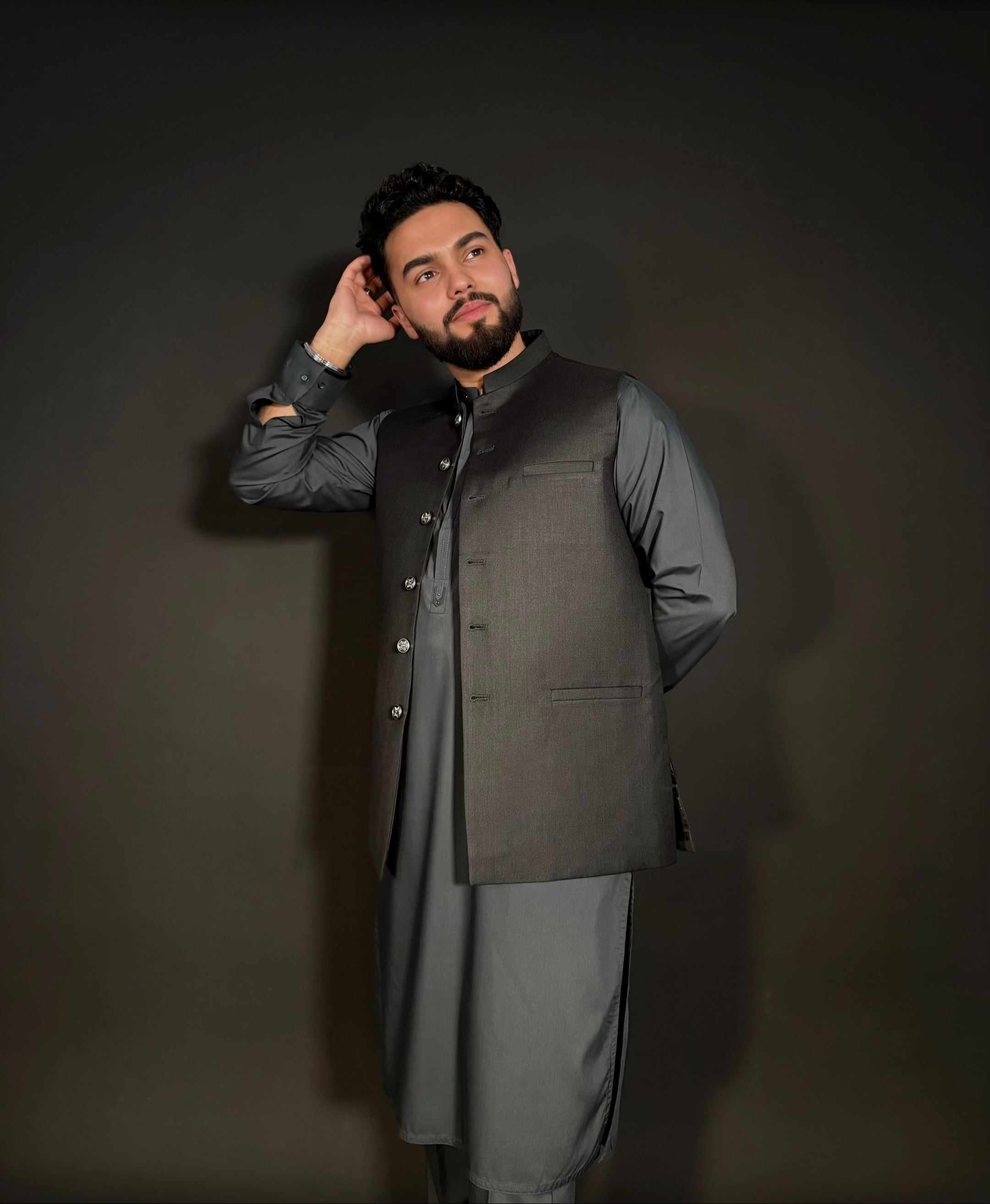 Ce waistcoat pakistanais allie élégance et modernité. Confectionné en tissu gris foncé avec une coupe structurée, il se distingue par son col bandhgala raffiné et ses boutons métalliques travaillés.