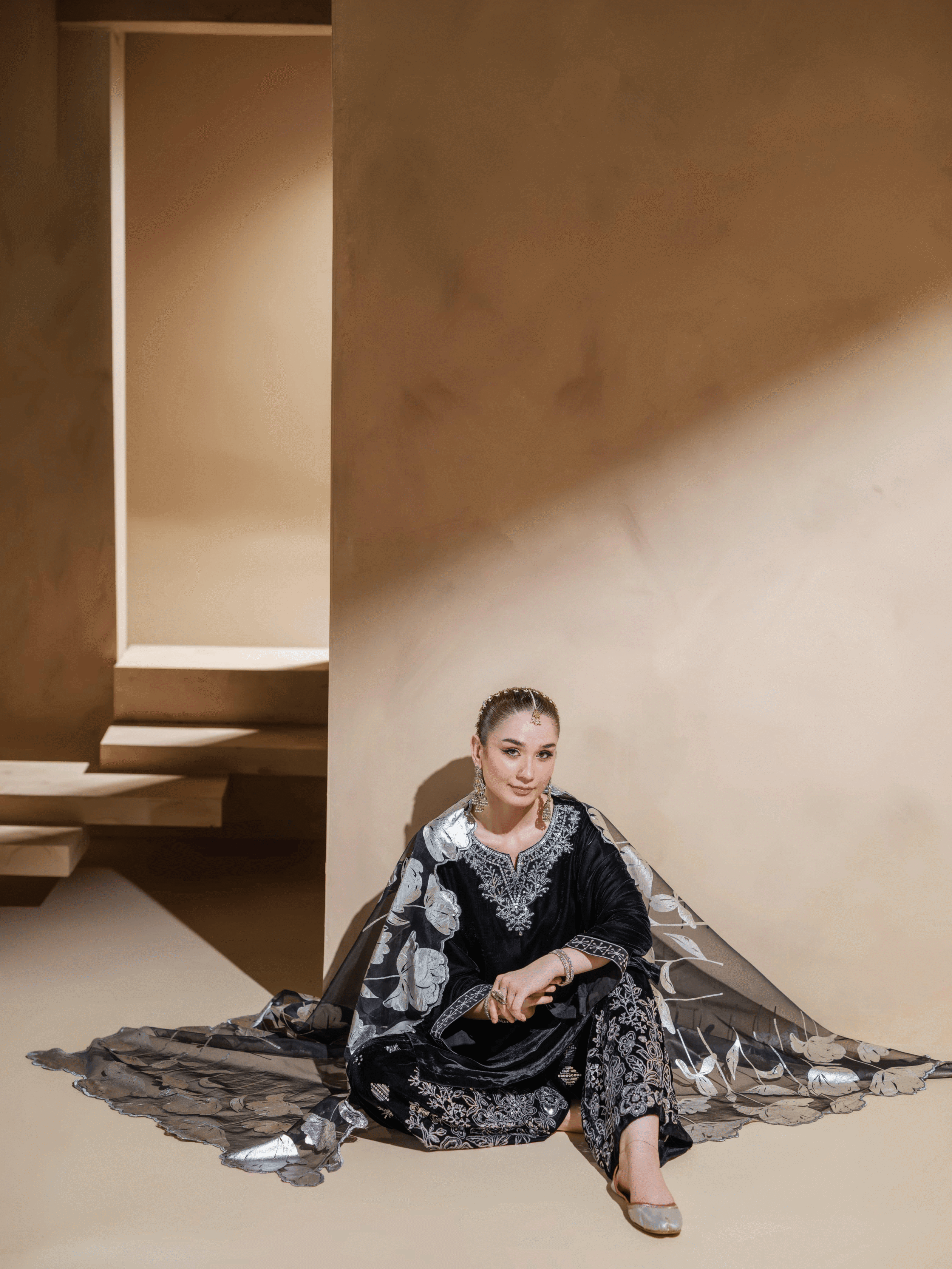 L’ensemble se pare d’un dupatta sophistiqué en organza, orné d’un motif imprimé de style cutwork, pour un rendu chic et harmonieux.