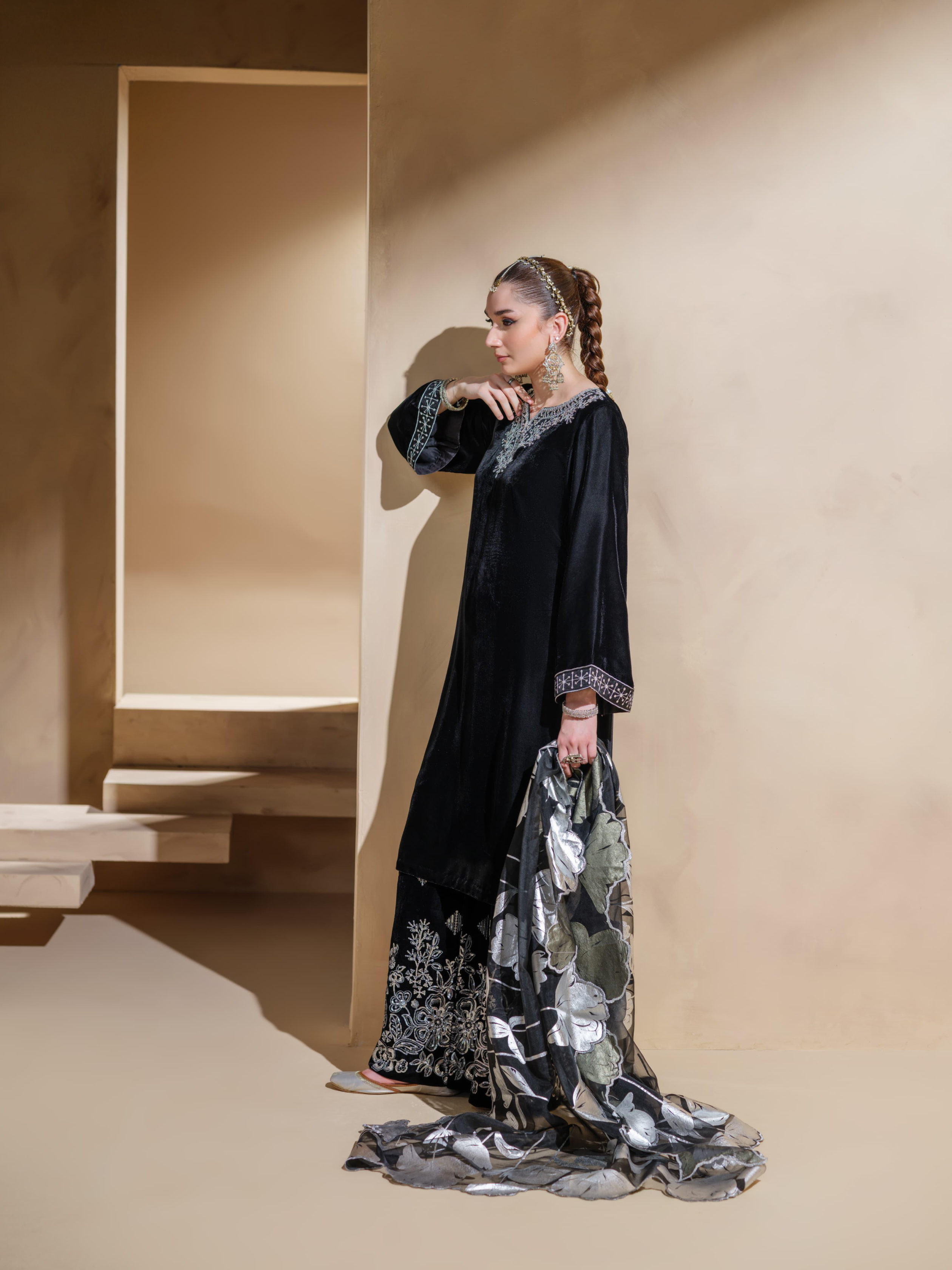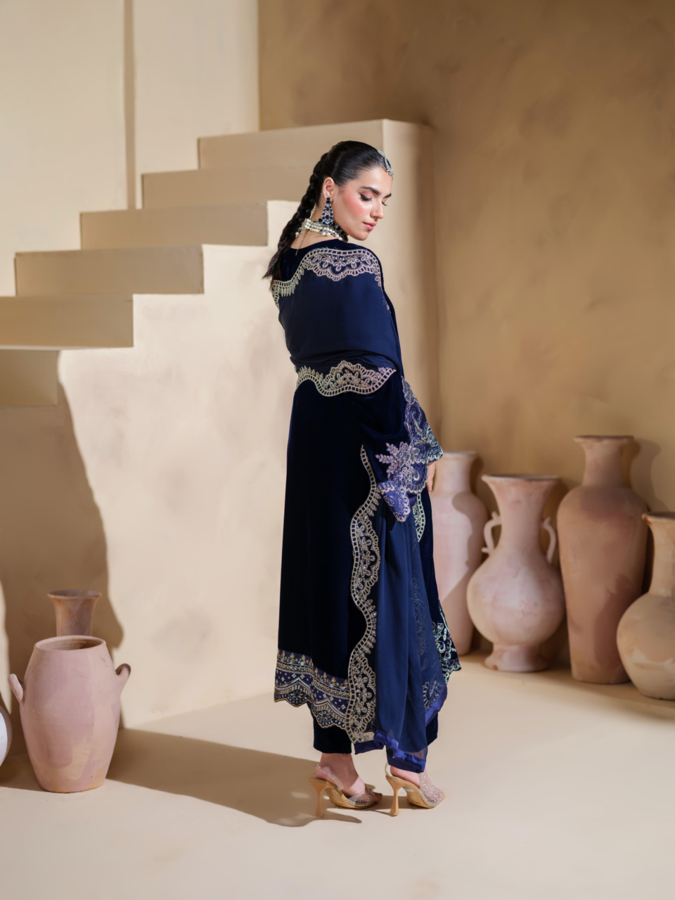 Le pantalon assorti en velours, orné de délicates broderies et sequins, complète parfaitement la tenue avec style et élegance.