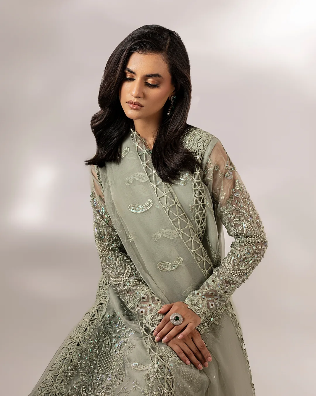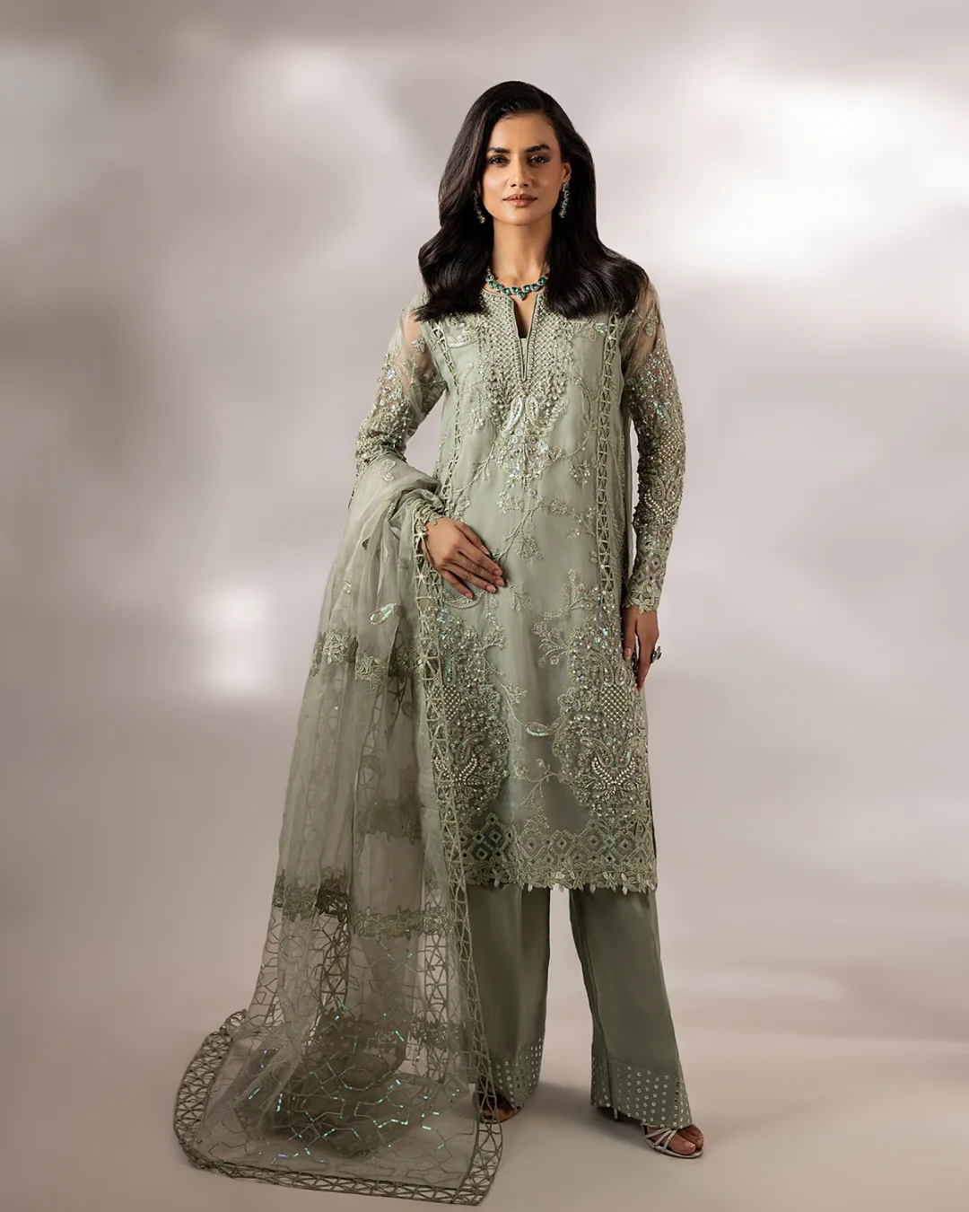 Le dupatta en organza est élégamment orné de broderies et de strass, ajoutant une touche chic et harmonieuse à l’ensemble.