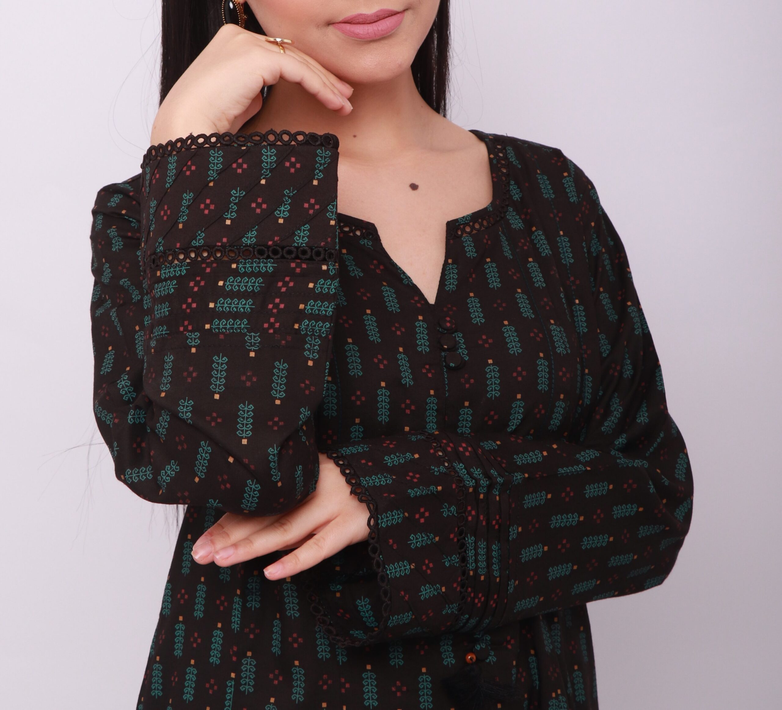 Cette tunique en linen imprimé est ornée de fines dentelles à l’encolure et au bas de la tunique, offrant une élégance minimaliste et soignée.
