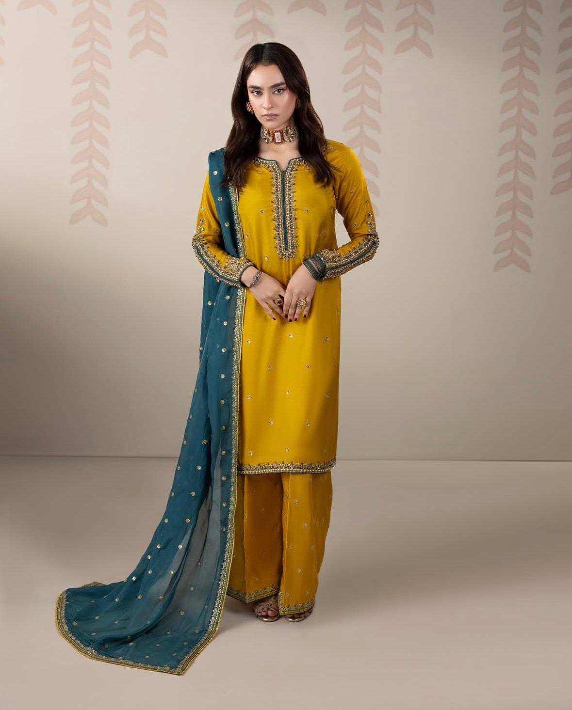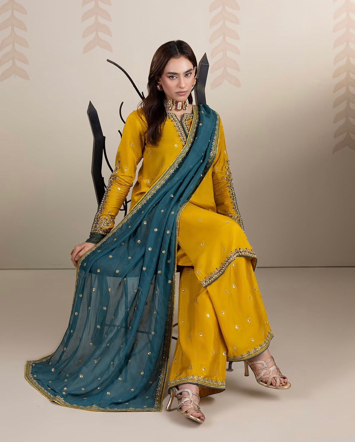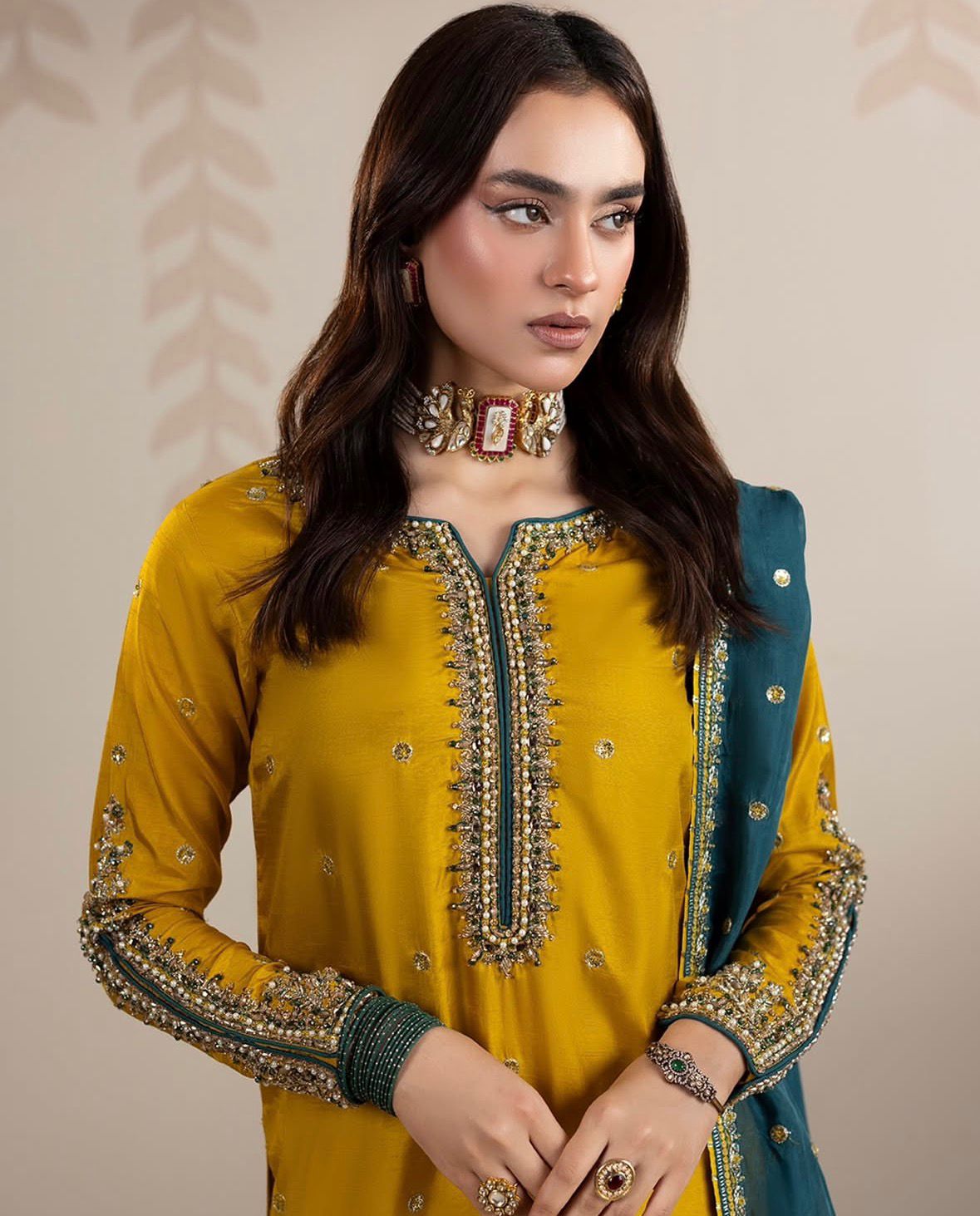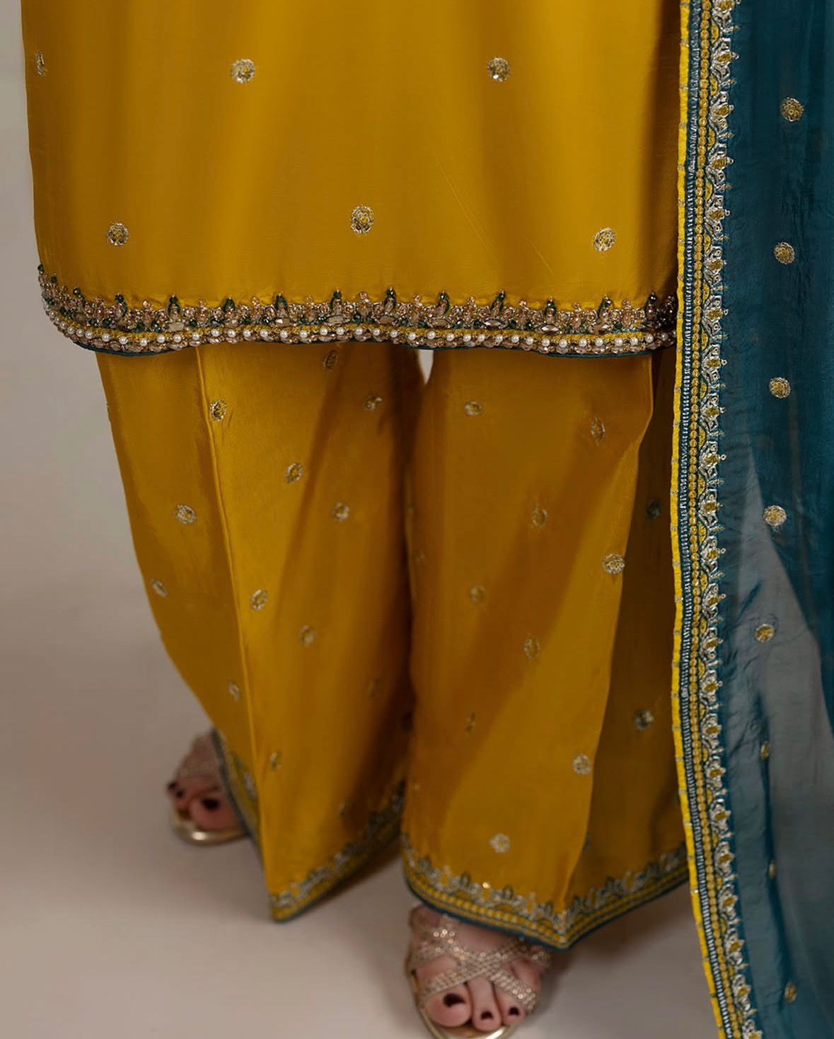 Le dupatta  entièrement sublimé par de délicates broderies et perlages , apportant une touche chic et harmonieuse à l’ensemble.