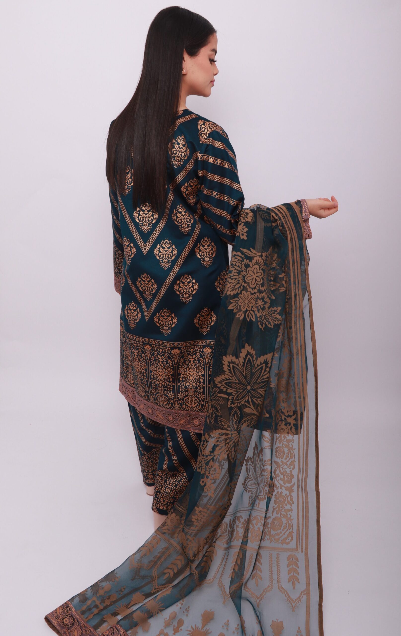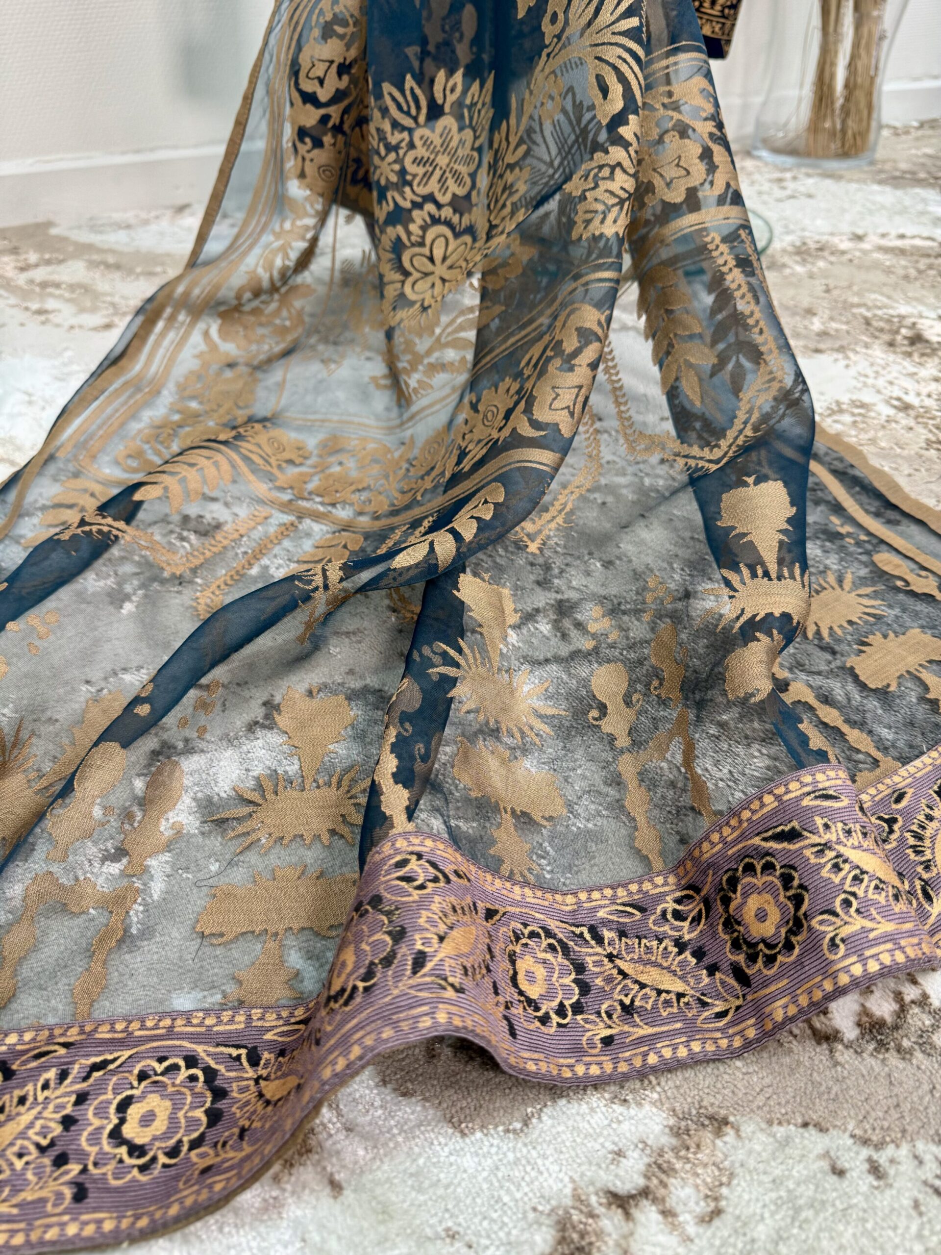 Le foulard en organza imprimé, ajoute une touche sophistiquée et harmonieuse à l’ensemble.