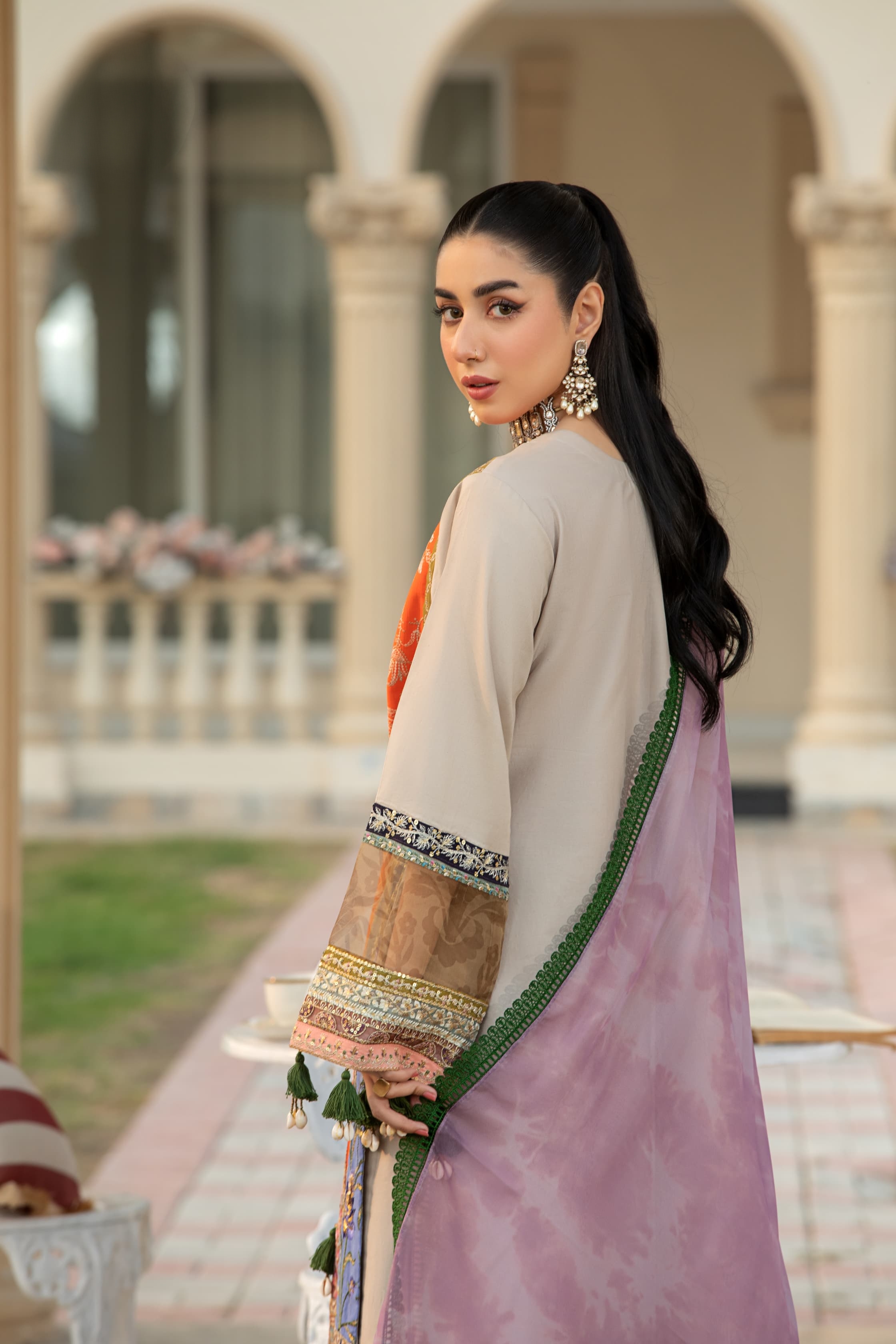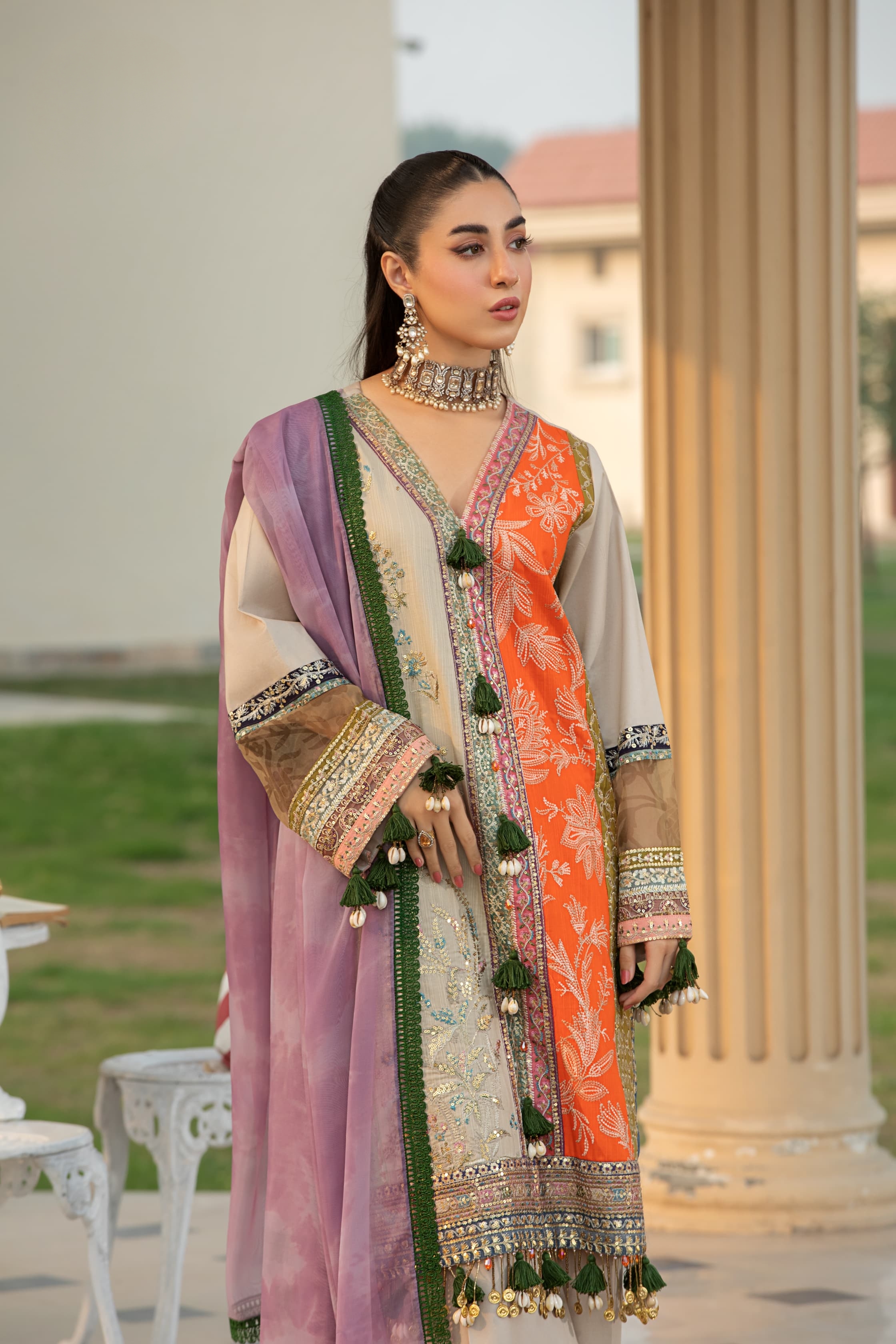 Le dupatta en chiffon, sublimé par de délicates dentelles, apportant une touche chic et harmonieuse à l’ensemble. ✨