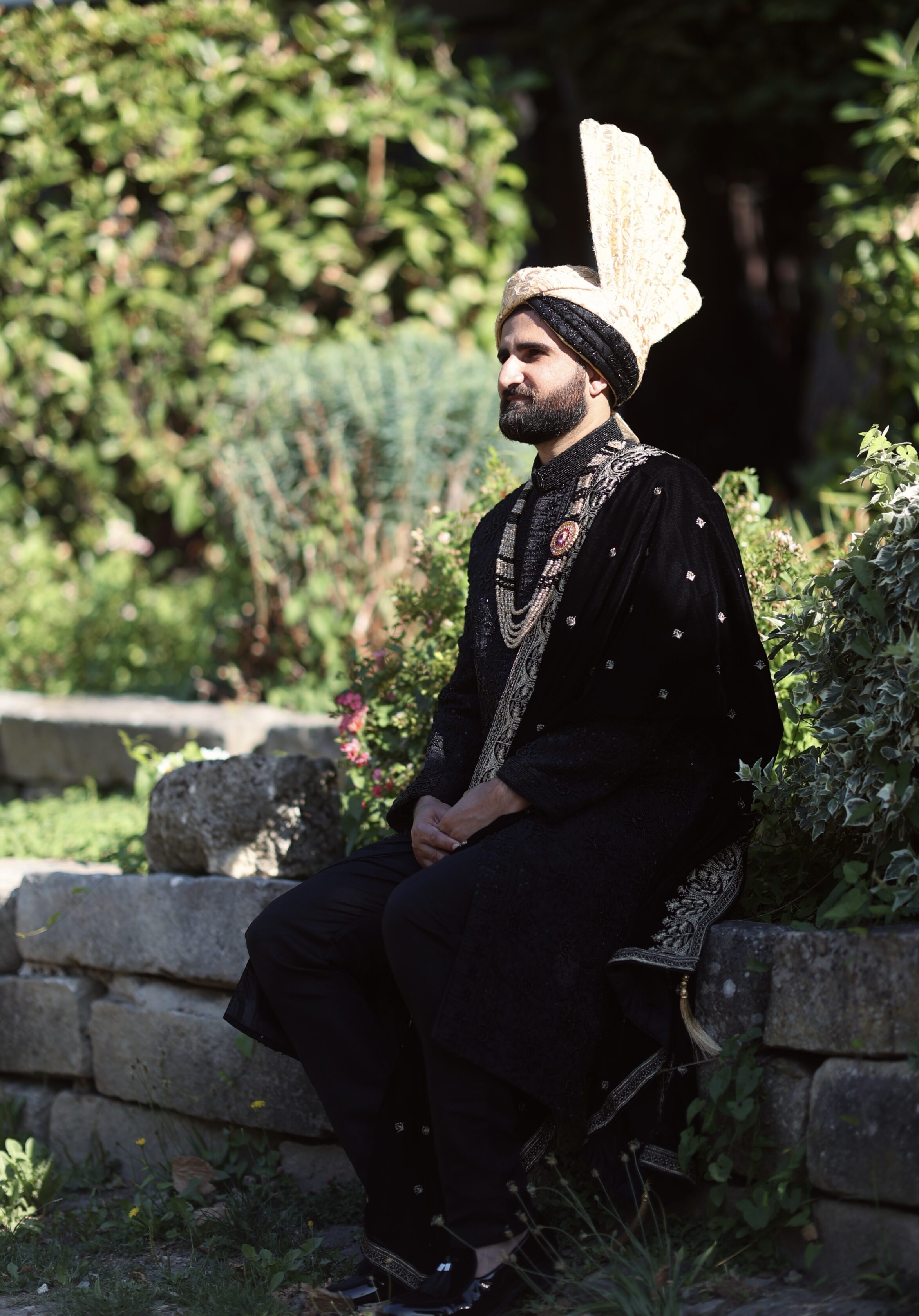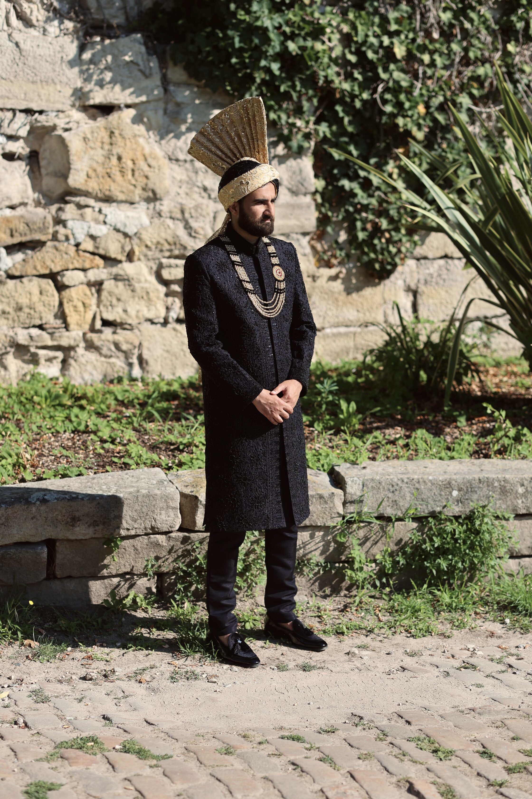 Sherwani d’exception, richement brodée et ornée de perles délicates, alliant tradition et raffinement. Conçue pour sublimer votre allure et illuminer votre présence lors du plus beau jour de votre mariage.