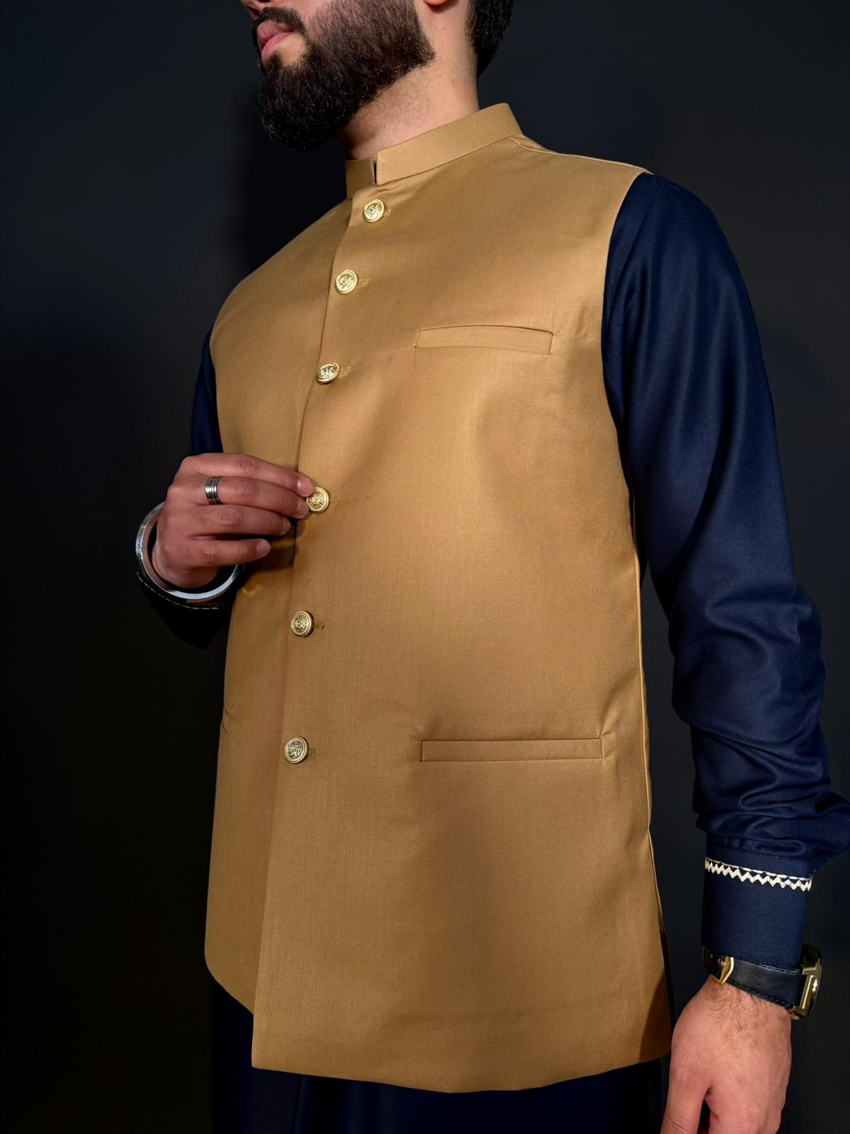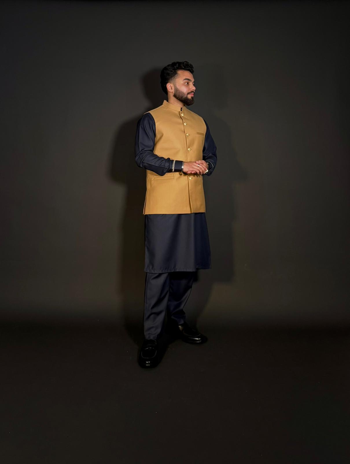 Ce waistcoat pakistanais allie élégance et modernité. Confectionné en tissu camel avec une coupe structurée, il se distingue par son col bandhgala raffiné et ses boutons métalliques travaillés.